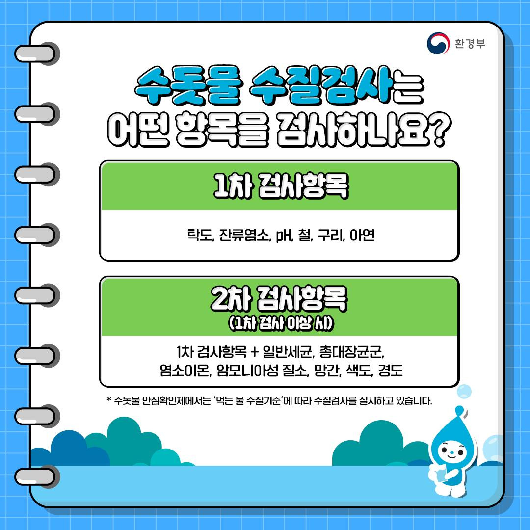A. 탁도, 잔류염소, pH, 철, 구리, 아연, 망간 등 주요 항목이 포함됩니다.