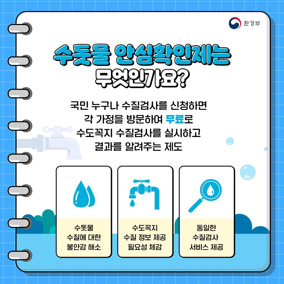 ‘수돗물 안심 확인제’는 환경부 산하 한국수자원공사에서 운영하는 제도입니다. 전국 대부분의 지자체에서 참여하고 있으며, 가정 내 수돗물 수질을 무료로 검사해줍니다. ‘물사랑 누리집’ 또는 전화 신청을 통해 간편하게 서비스를 신청할 수 있습니다.