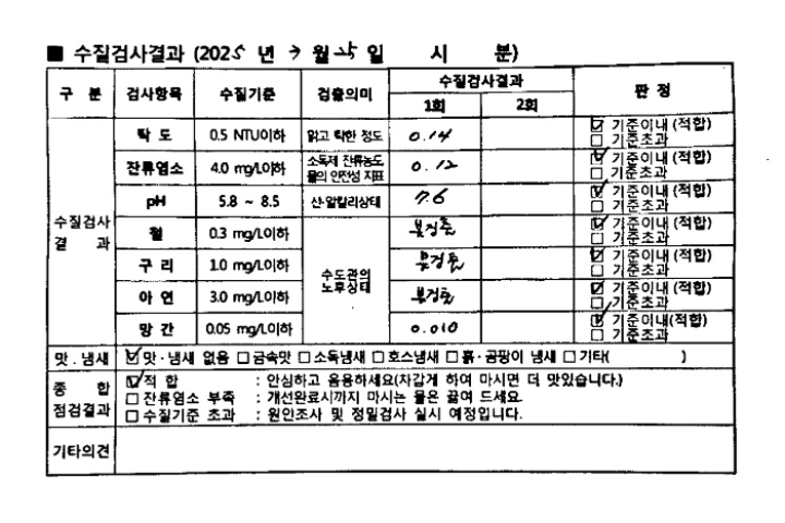 대구 달성군의 한 아파트 주민이 수질 검사를 신청한 실제 사례에 따르면, 플라스틱 통을 제공받고 수돗물을 받아 현관 앞에 두기만 하면 검사원이 수거해 갑니다. 검사 결과는 문자와 함께 결과지로 받아볼 수 있으며, 대부분 기준 내 ‘적합’ 판정을 받고 있습니다.
