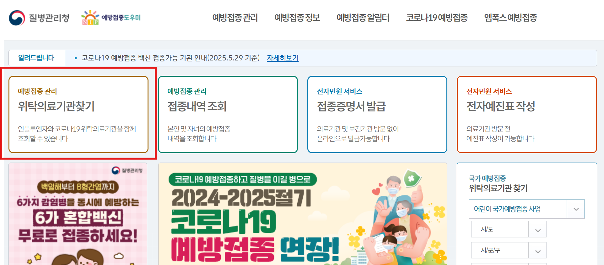 - 상단 '예방접종 관리 위탁의료기관찾기' 클릭